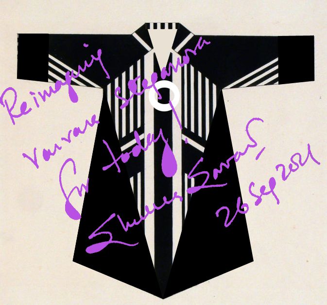 Curator’s Note: In this design, a version of a dress by the Russian avant-garde artist Varvara Stepanova who designed clothes for working women, Shukla Sawant makes functional improvements to the kurta. It does not suffer from what a lot of designs aimed at women seem to be missing—pockets. The cuffs too, look like it could hold items. And in what looks like a statement button/brooch, we might find a version of a tie pin for a scarf. It seems to invoke the kaftans and tunics of West Asia, the Japanese haori, the Bhutanese gho, and the African boubou.