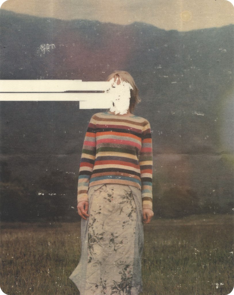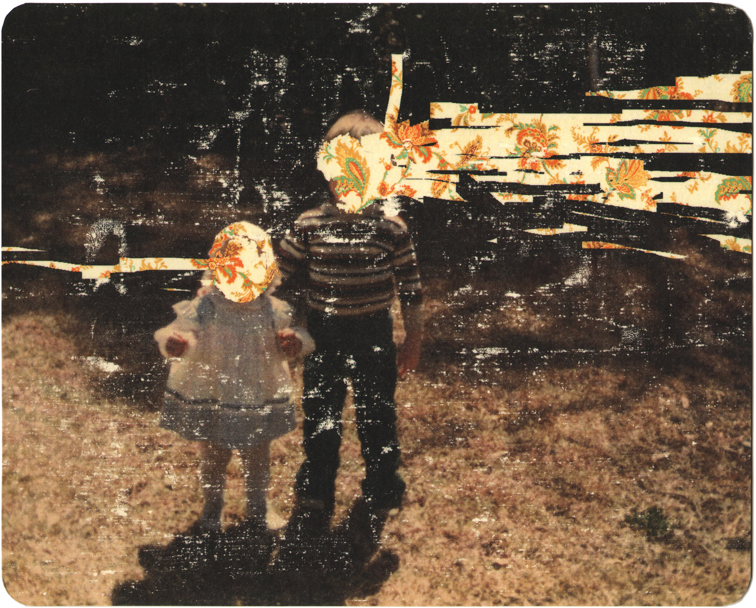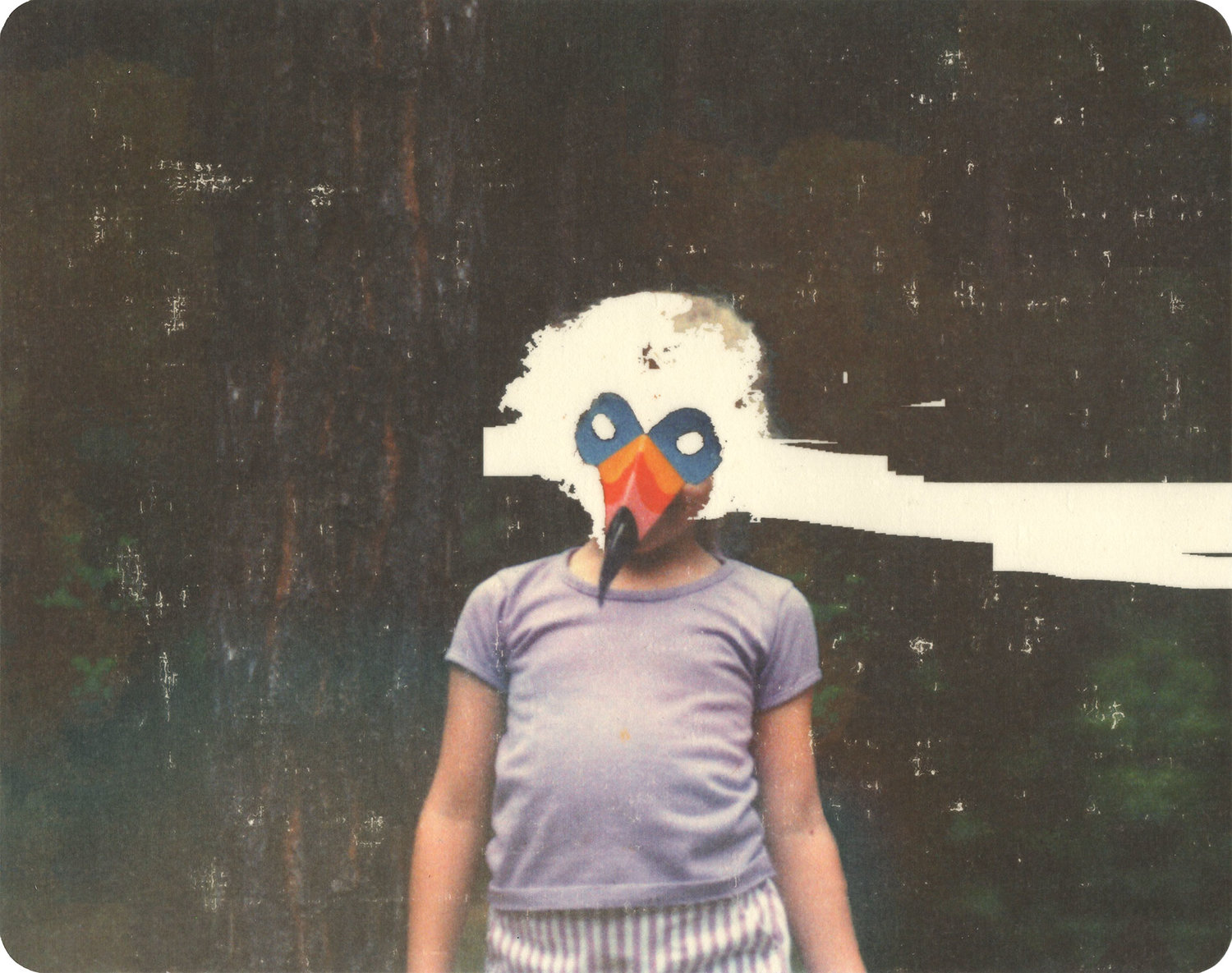 As if to momentarily displace the veil of anonymity centring family, or family photographs, the artist employs a quirky way to thrust some identity back into those erasures; he fondly titles few of the photographs by proper nouns. We see pigment transfer on paper indeterminately titled ‘Freddie’ where the person in the photograph has dainty blonde curls surrounding the face; ‘Leona’ standing in a meadow wearing a multi-striped pullover; and ‘Toucan Sam’—my most favourite—the image of a slightly potbellied kid with a bird-mask on its face. Rummaging through his website, I stumbled upon an unexpected piece of information about Thornton’s daughter—she’s called Leona. It was mildly amusing to reflect on the photographer’s choice of subject, and also the cultural longevity of digitized images as vessels of filial memory. The archived ‘Leona’ appears to be not a six-year old child but a grown woman at least in her adolescence. There appears to be not a mere emptying of memory into literal voids but perhaps also a blending of identities. What follows is not a melancholic obsession about being unable to remember or locate, but a playful mind game of who’s who, as if almost hunting for visual clues, or cues, thrust into faded corners. Being your own memory detective into someone else’s bildungsroman. Pretty sneaky, eh?