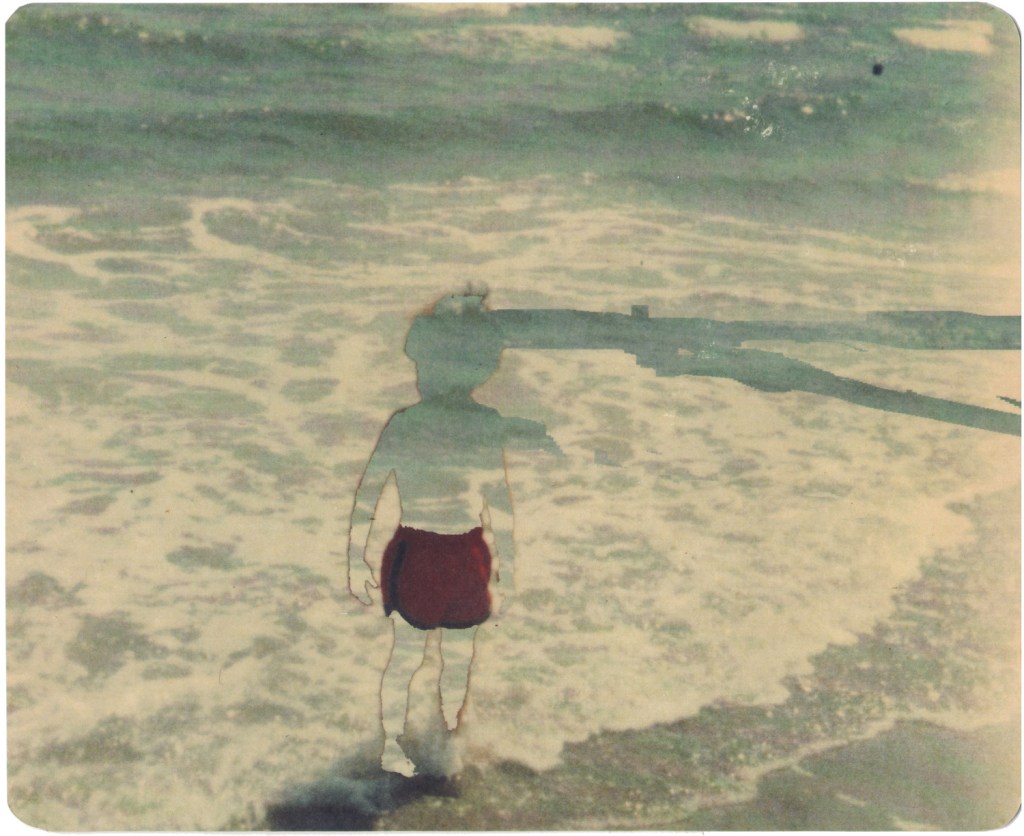 Thornton stretches this element of photographic occlusion to an ultimate point of opacity. Using pigment transfer on papers, Thornton carefully erases the faces from their human frames leaving behind a literal blank. At first I thought—or so it resembled to my inexperienced eye—that faces had been meticulously scratched off of photographs with a sharp-edged object—remnants of an overused cliché in psycho-predator flicks. Looking closely, I recognized a method to this systematic elimination—one which, despite its artistic endeavour, triggered an uncanny sensation similar to what someone might feel during those flicks when presented with such images on celluloid—communicating a sense of calculated dread, hatred even. Thornton replicates this erasure through a series of images, essentially family photographs, often leaving a trail of depigmented space conveying a false sense of motion. In its own way, the pigment transfers can be quite beautiful to witness, gradually placating the initial dread with a more relaxed, renounced sense of melancholy. You’re haunted by and dispelled of your fear at the same time, getting pulled closer into the art’s and artist’s play of forced anonymity.