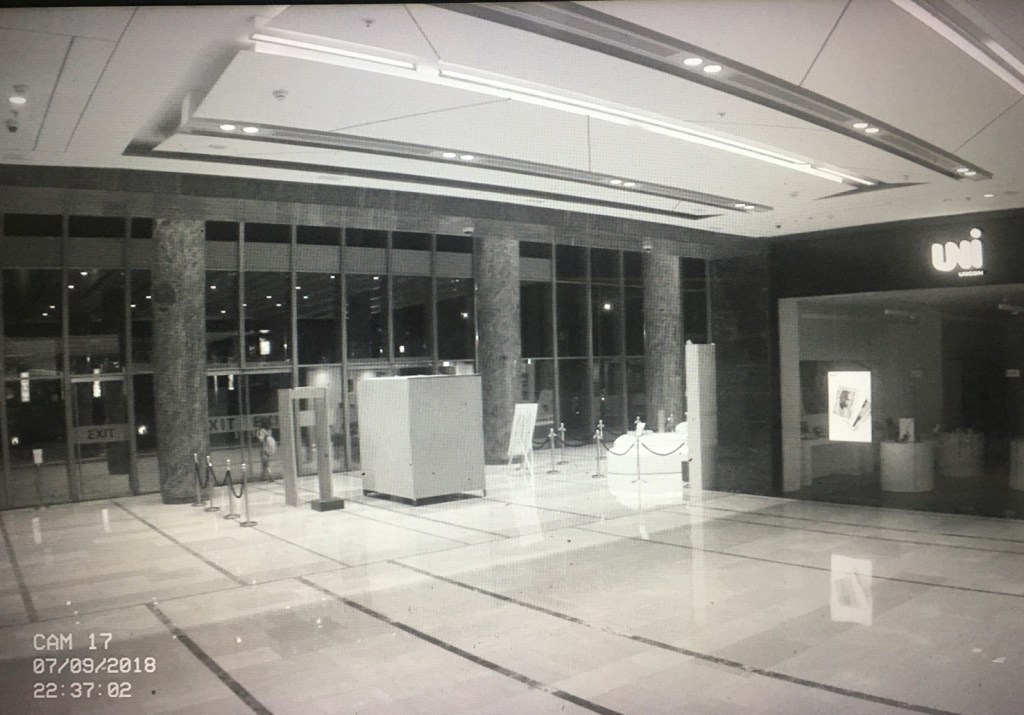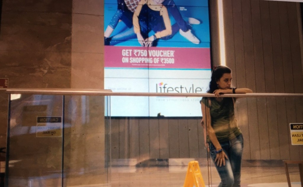 This rebellion starkly contrasts the submissive culture of the greater space of the mall where Sargam often loiters waiting for another chance to be at the frisking line. This commercial bubble of modernity lays bare several contradictions. Consider, for example, the hypersexualised images adorning the walls of the mall, which despite being billboards of desire, are still gendered in terms of their target audience. Or the host of an impromptu singing talent hunt who casually asks Sargam if she has a boyfriend. Amidst the host of international brands and imported cultures one assumes that the conservative cloak would seem too outdated. But, unfortunately, that’s not the case. There is still no place for people like Rekha and Sargam; their desire still needs the hush of the dark and heavy curtains of the booth. But though this booth appears to shrink in the vast and vacuous space of the mall—as seen from the CCTV footage—it is still just enough for two.