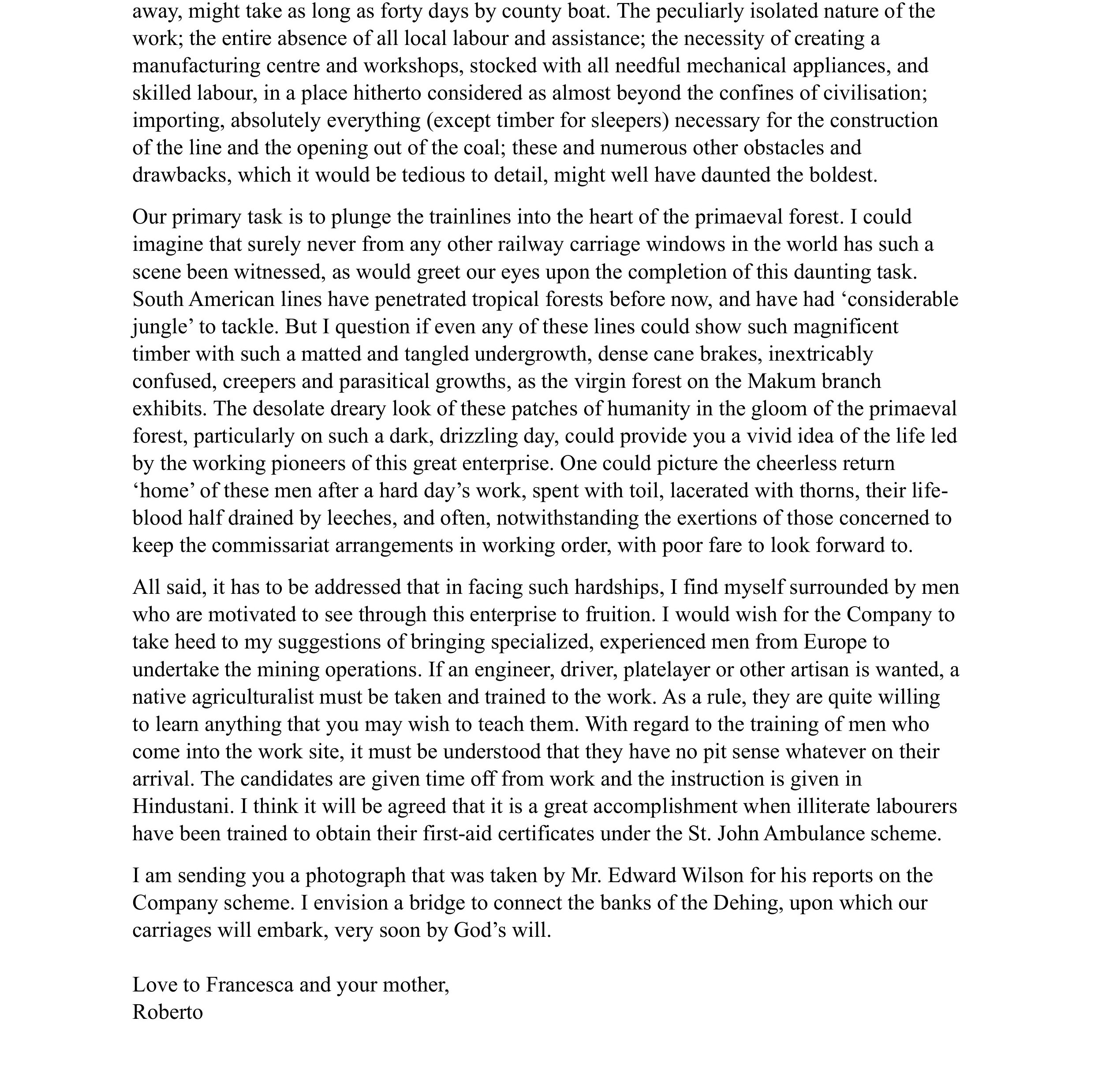 Found in the archives of Assam Railways and Trading Company Limited, the letter is believed to have been written by Chevalier Roberto Paganini, an Italian engineer who was invited by the British company-men to design and construct the railway lines and colliery-infrastructure in Makum, Assam in 1881. The letter sheds light on the micro, personal aspect of a colonial extractive enterprise, of which we learn mostly through statistics and infrastructural perspectives in postmodern times in context of the Indian subcontinent. The ART company operated in Makum from 1886 till 1950s, till the company’s departure post national independence and subsequently transformed into what we know as Coal India Limited today.