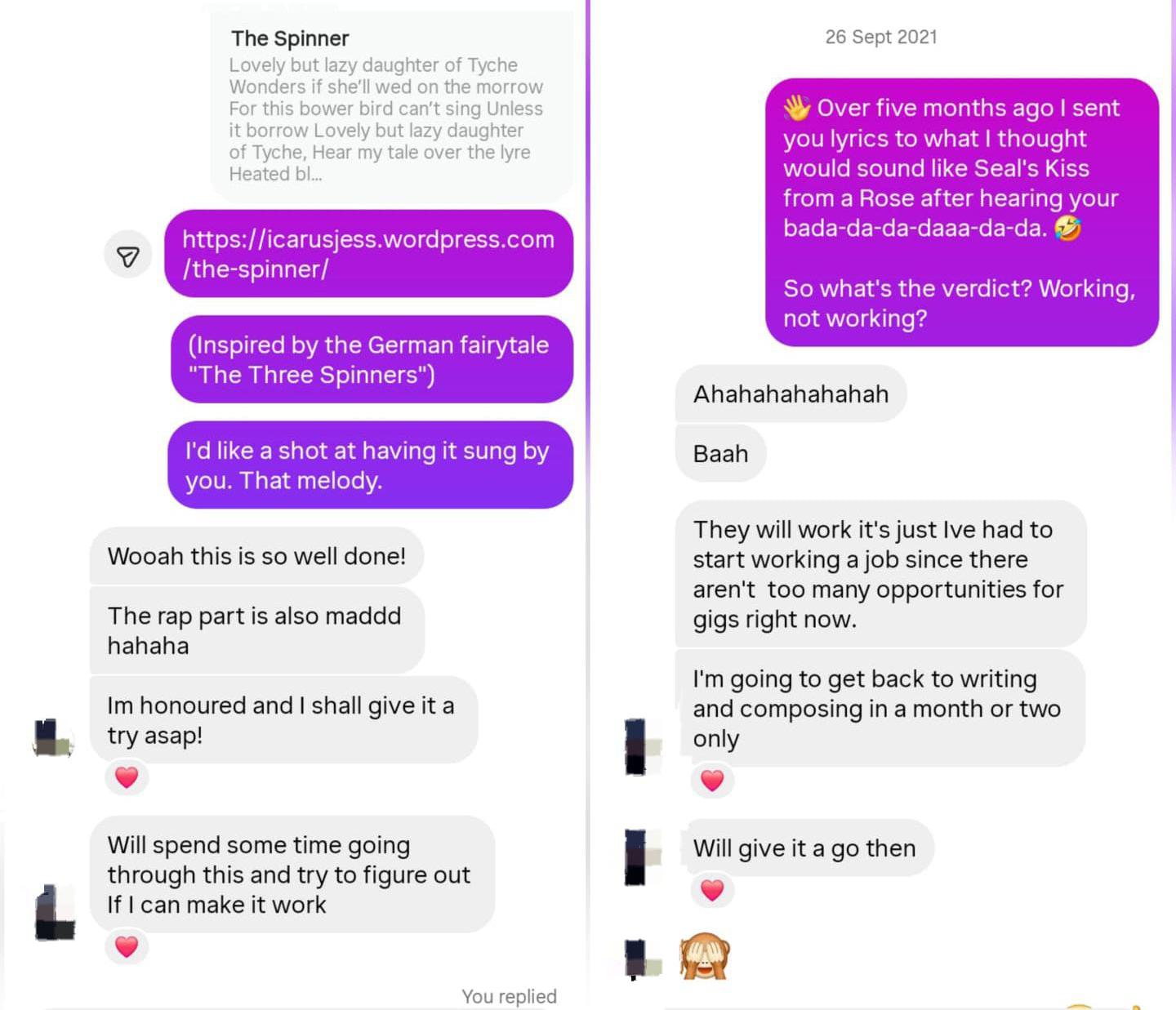 What came out were two songs that refused to be songs, “The Spinner” and “Before It Cools”. They had lyrics, technically. They had rhythm, in the way poems have syllabic meters. However, no musician could set them to music. Not because they were radical, or experimental, or ahead of their time but because they simply did not cohere. And there were just too many intertexts of a German folktale and an inside joke of the commissioning musician, producer and sound engineer being perpetually harassed with people asking him to DJ events. Although the singers assured me it was their work schedules or that it just was not their style. But apparently Bob Dylan would have been down for it.